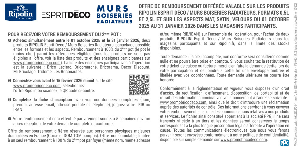 1. Pour recevoir votre remboursement, achetez entre le 1er octobre 2025 et le 31 janvier 2026 inclus, deux produits RIPOLIN Esprit Déco / Murs Boiseries Radiateurs, parmi les références éligibles (panachage possible entre les formats et les aspects).