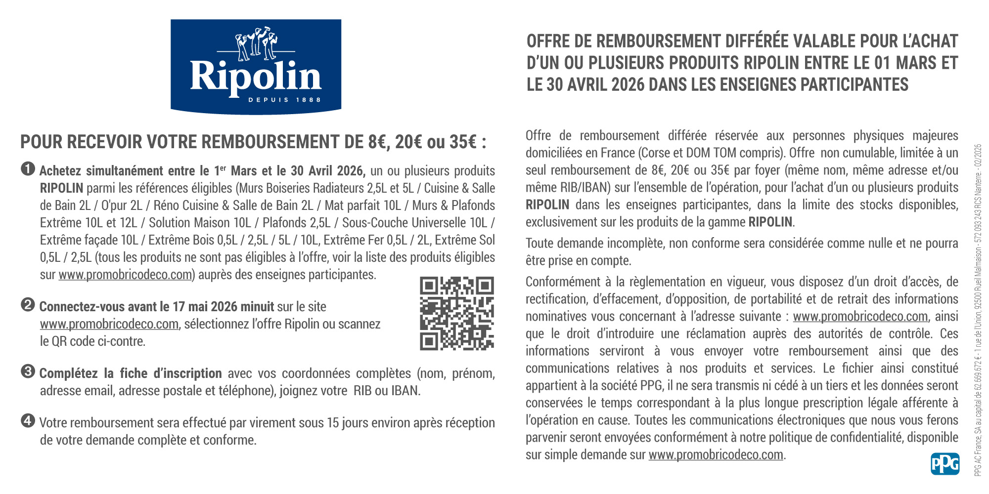 1. Pour recevoir votre remboursement, achetez entre le 1er mars et le 30 avril 2026 inclus, un ou plusieurs produits RIPOLIN parmi les références éligibles.