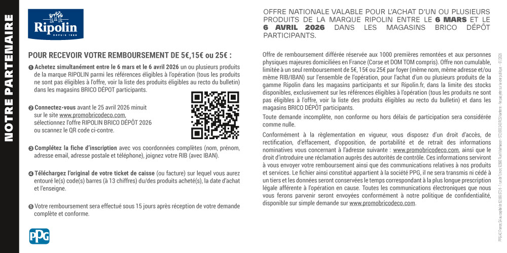 1. Pour recevoir votre remboursement, achetez entre le 6 mars et le 6 avril 2026 inclus, un ou plusieurs produits de la marque RIPOLIN parmi les références éligibles à l'opération.